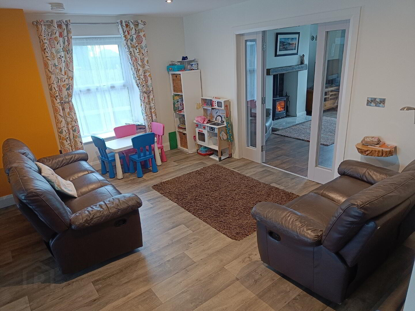 Large living room with log burner.