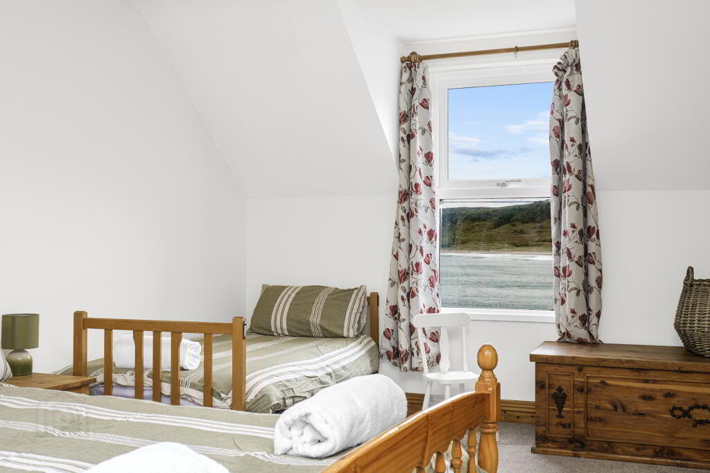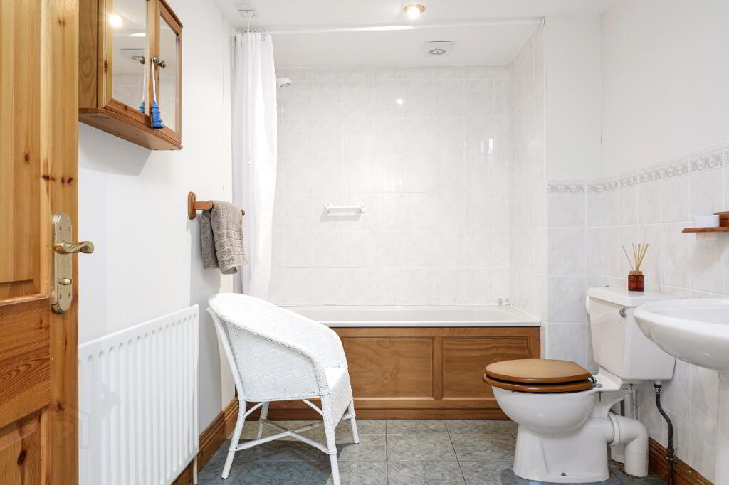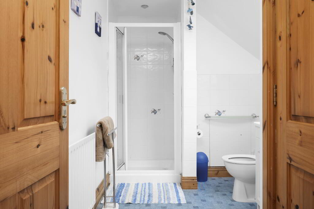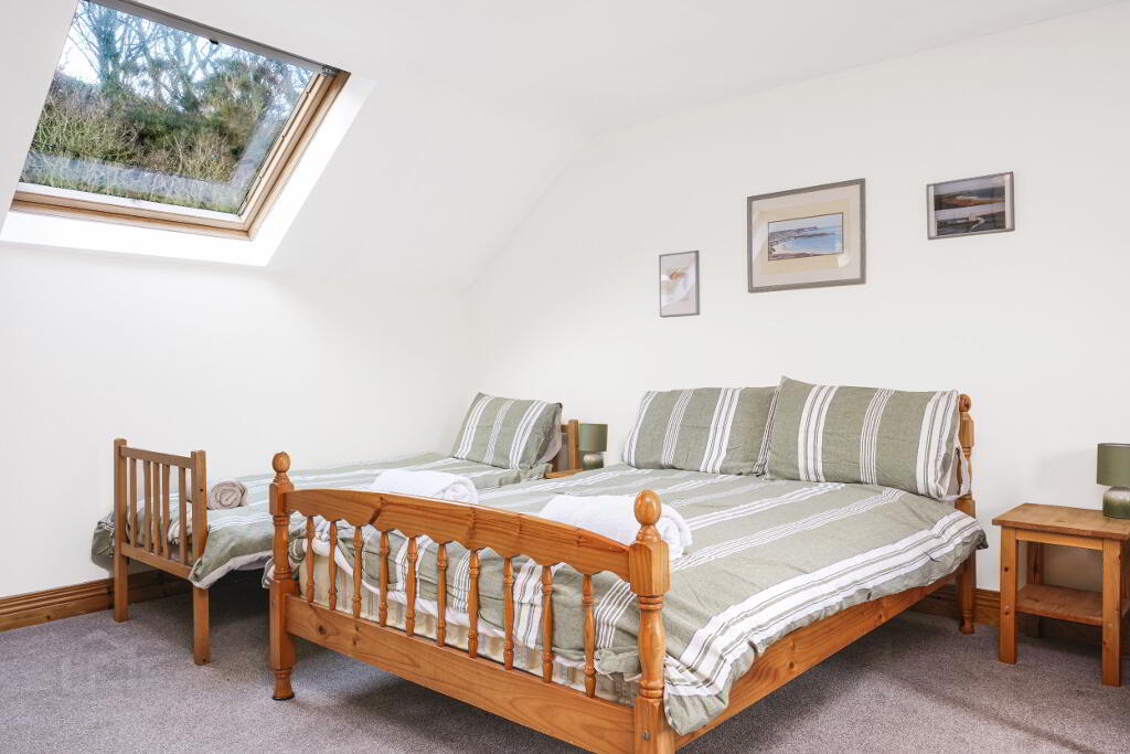This charming cottage has 3 bedrooms . Upstairs it has a double bedroom with a couple of small singles for small children and a shower room. Downstairs it has a twin room and double room along with a family bathroom with a bath and shower over the bath.