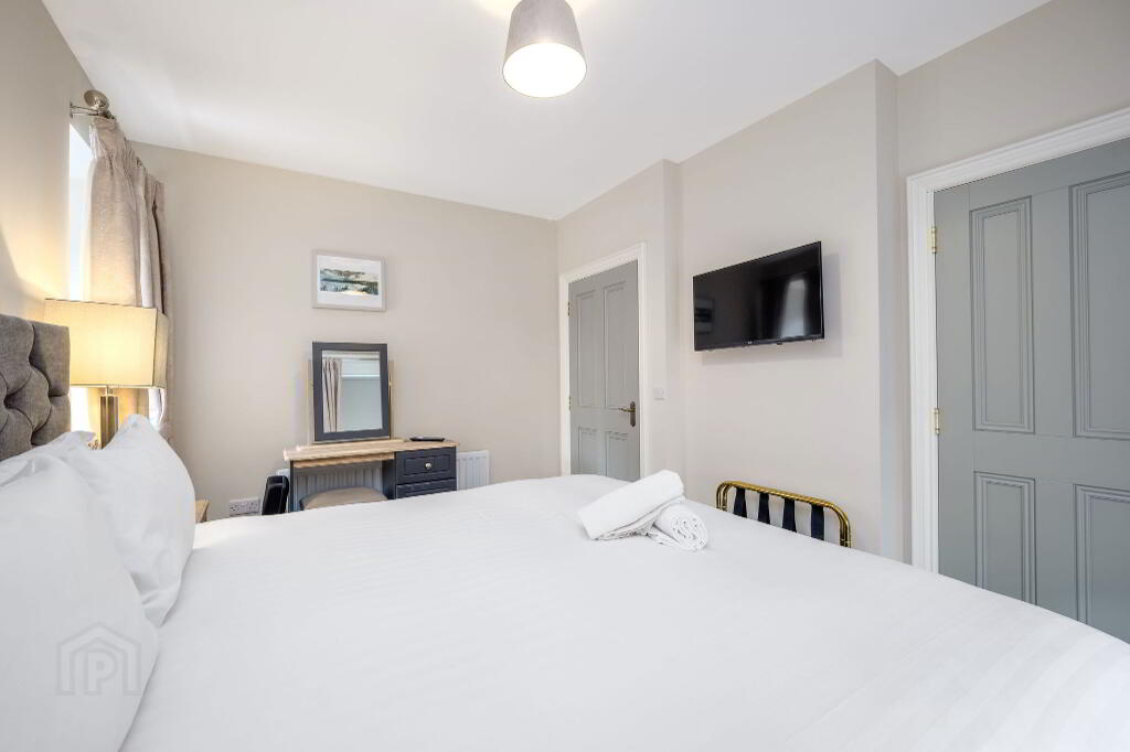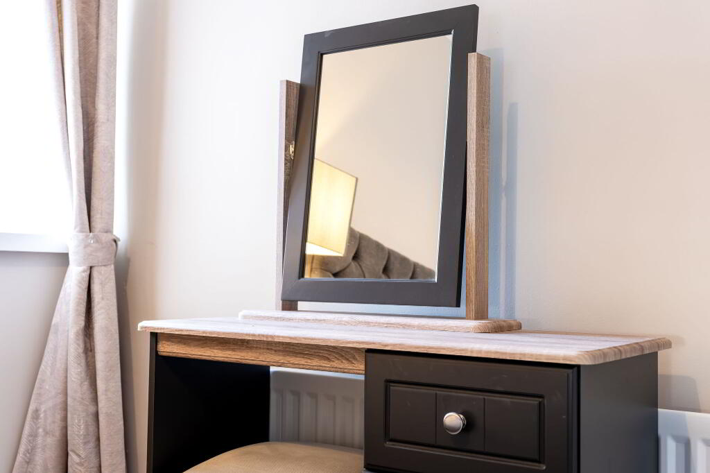 The spacious bedroom boasts a luxurious superking-size bed, ensuring a restful night’s sleep. A TV in the bedroom adds an extra touch of comfort, ideal for cosy evenings in.