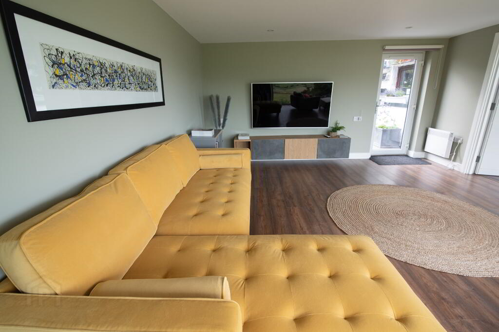 There is another separate living room, equipped with a second 60 inch TV and equally relaxing view out across the fields. From here you access a lovely spacious balcony with outdoor seating area.